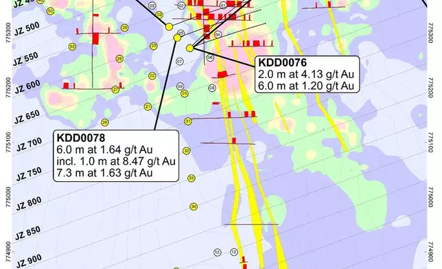 Drill hole KDD0076 was completed using an azimuth of 045° to test the effectiveness of the current drill orientation. In contrast, drill holes KDD0077 through KDD0079 were completed at the standard 070° azimuth. Results from this test confirm that the 070° orientation remains optimal for targeting the mineralized structures at Jagger, and that no adjustments to the current drilling pattern are necessary.