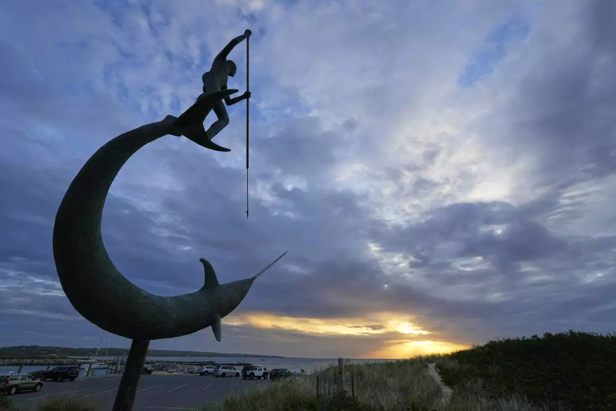 A sculpture of a fishermen harpooning a swordfish stands near Menemsha Beach, Wednesday, May 14, 2025, in Chilmark, Mass. (AP Photo/Robert F. Bukaty)