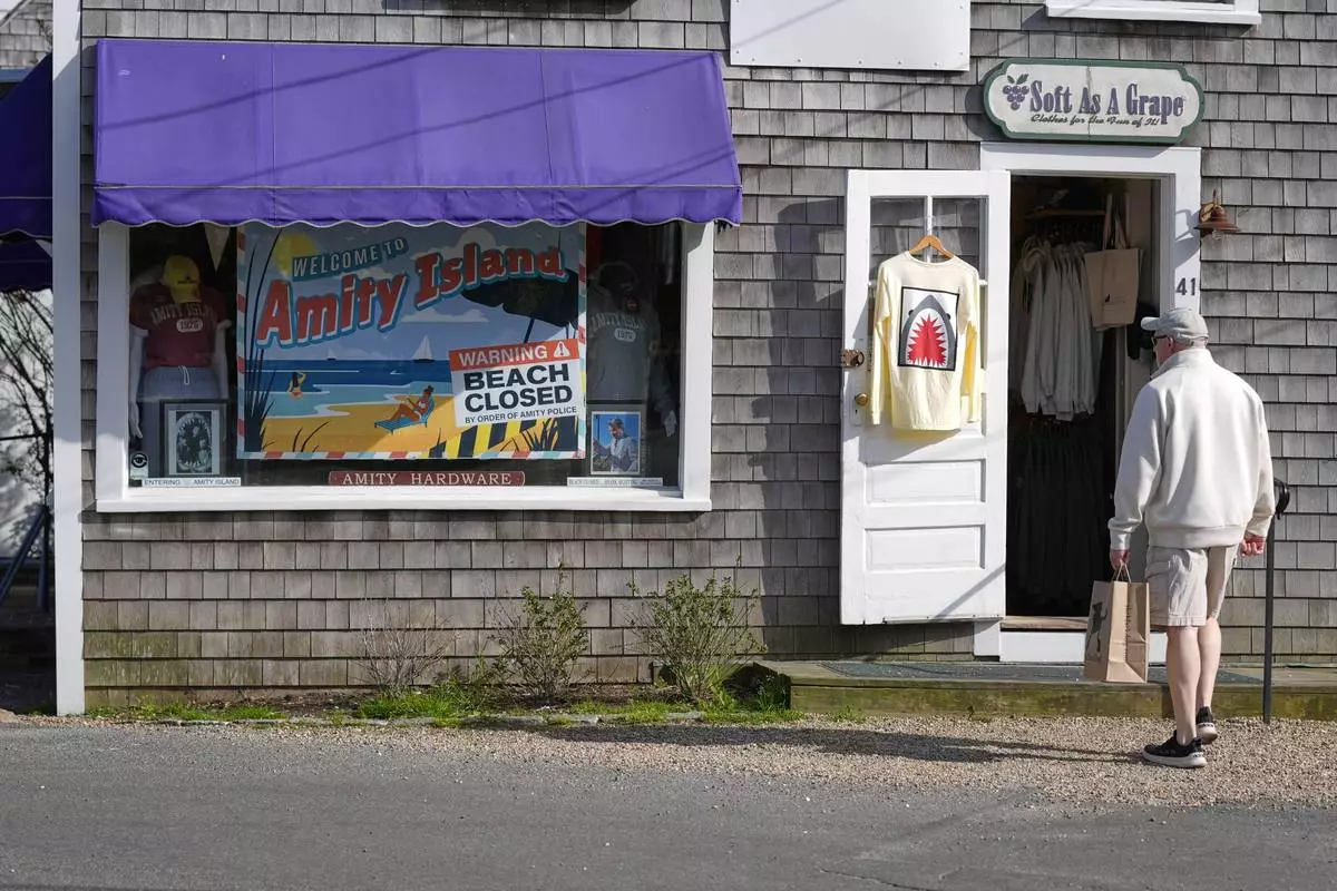 A visitor arrives at a shop selling Jaws-related souvenirs, Wednesday, May 14, 2025, in Edgartown, Mass. (AP Photo/Robert F. Bukaty)