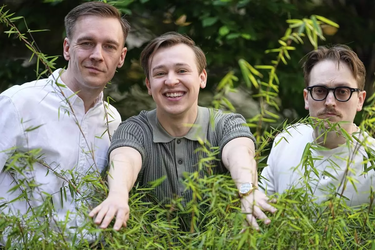 Swedish Eurovision contestants KAJ from Finland, Kevin Holmstrom, Jakob Norrgard and Axel Ahman, from left, pose for the camera before an interview with the Associated Press during the 69th Eurovision Song Contest week, in Basel, Switzerland, Thursday, May 15, 2025. (AP Photo/Martin Meissner)