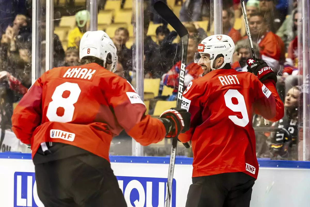 Switzerland's scorer Damien Riat, right, and his teammate Simon Knak, left, celebrate the opening goal during the IIHF 2025 World Championship group B match between Switzerland and Germany in Herning, Denmark, Thursday, May 15, 2025. (Salvatore Di Nolfi/Keystone via AP)