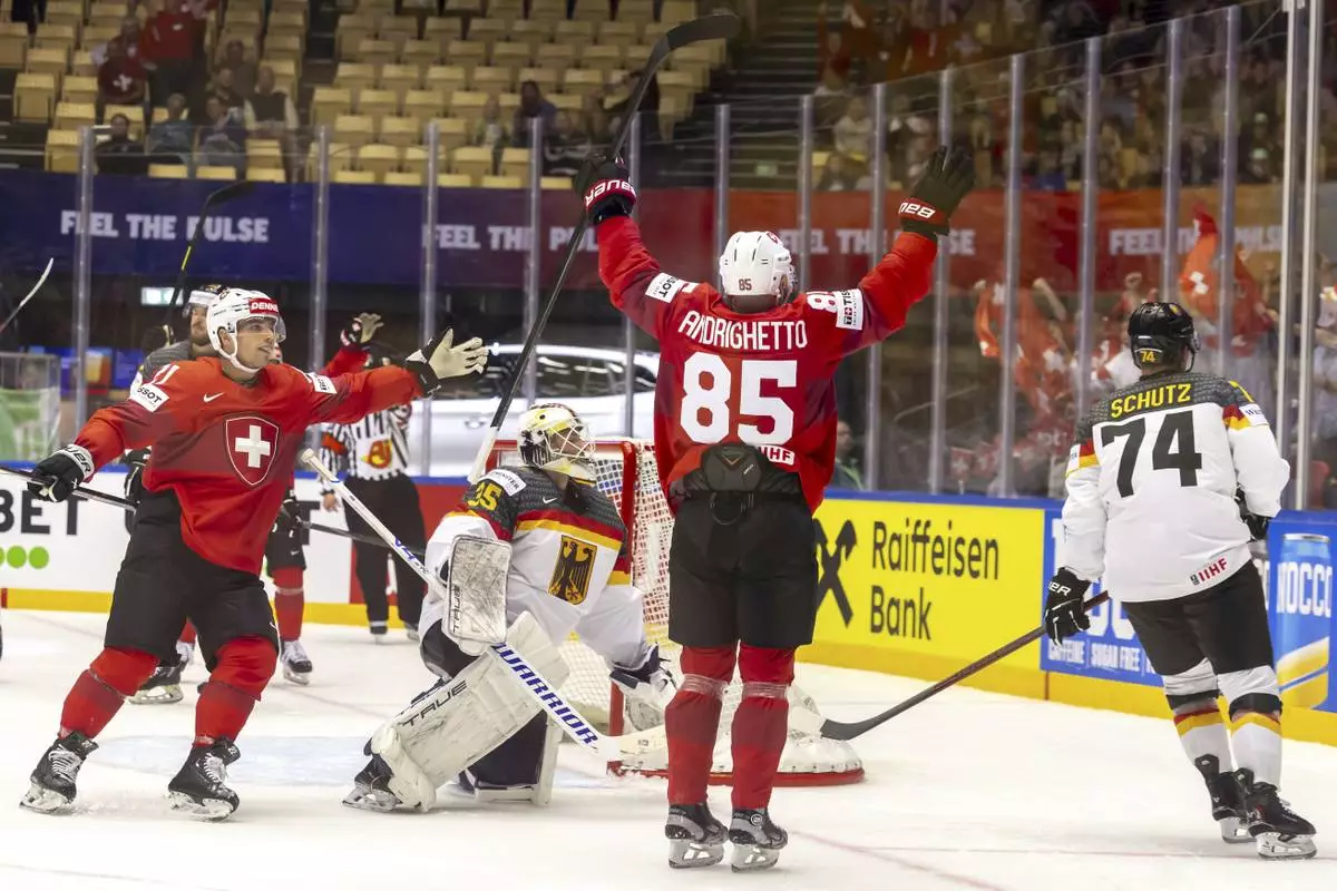 Earlier in Herning, Sven Andrighetto scored four goals to lift Switzerland to a 5-1 victory over Germany.