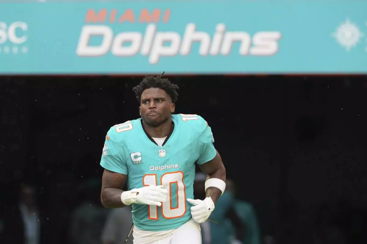 FILE - Miami Dolphins wide receiver Tyreek Hill (10) enters the field before an NFL football game against the San Francisco 49ers, Sunday, Dec. 22, 2024, in Miami Gardens, Fla. (AP Photo/Rebecca Blackwell, File)