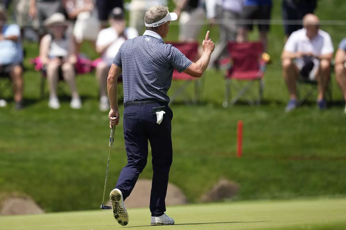 Luke Donald, of England, waves after making a putt on the 14th hole during the first round of the PGA Championship golf tournament at the Quail Hollow Club, Thursday, May 15, 2025, in Charlotte, N.C. (AP Photo/Matt York)