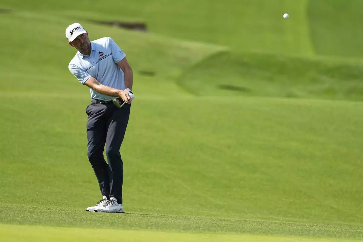 Keegan Bradley chips to the green on the 14th hole during the first round of the PGA Championship golf tournament at the Quail Hollow Club, Thursday, May 15, 2025, in Charlotte, N.C. (AP Photo/Matt York)