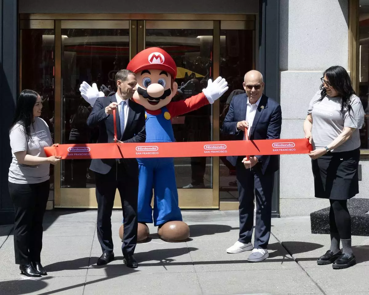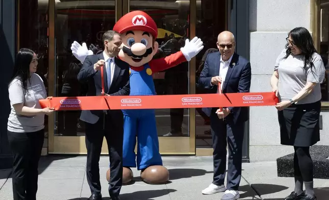 In this photo provided by Nintendo of America, Nintendo SAN FRANCISCO officially opened with a ribbon cutting ceremony featuring Nintendo of America President Doug Bowser, San Francisco Mayor Daniel Lurie and Mario.