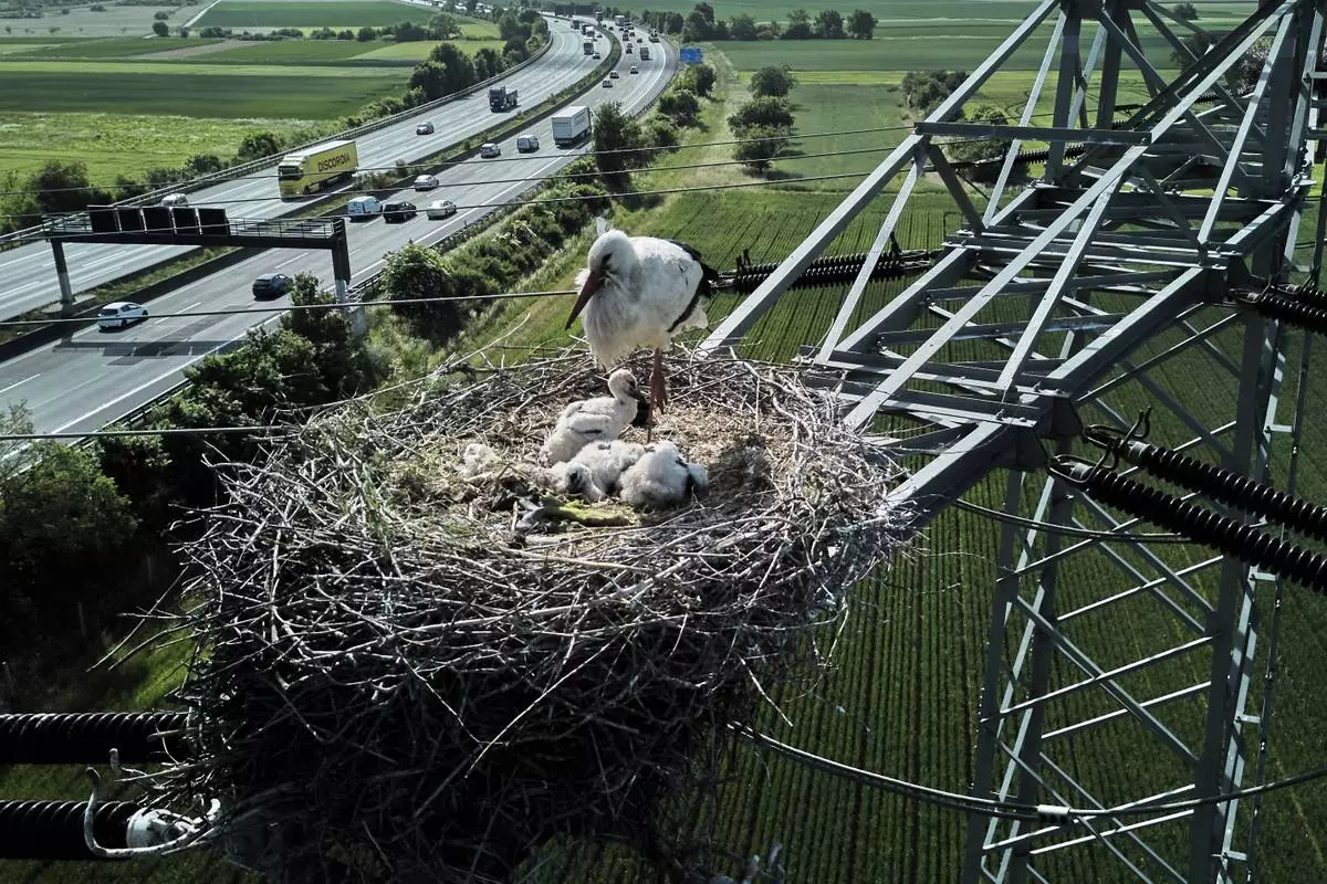 A mother stork guards her storklets on the outskirts of Frankfurt, Germany, Thursday, May 15, 2025. (AP Photo/Michael Probst)