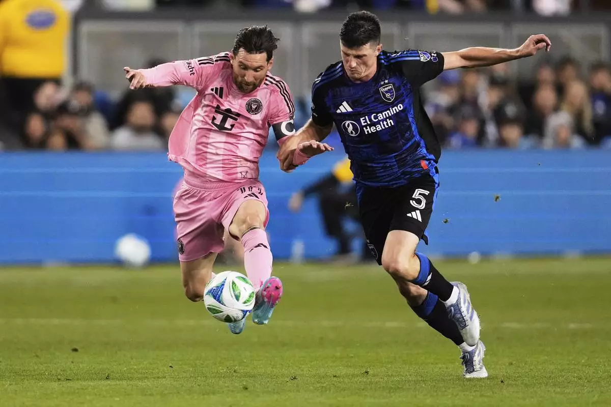 Inter Miami midfielder Lionel Messi, left, and San Jose Earthquakes defender Daniel Munie compete for possession of the ball during the second half of an MLS soccer match Wednesday, May 14, 2025, in San Jose, Calif. (AP Photo/Godofredo A. Vásquez)