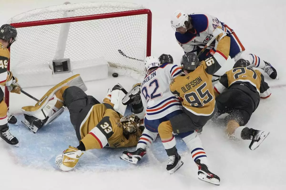 Edmonton Oilers right wing Kasperi Kapanen (42) scores against the Vegas Golden Knights during overtime of Game 5 of a second-round NHL hockey playoff series Wednesday, May 14, 2025, in Las Vegas. (AP Photo/John Locher)