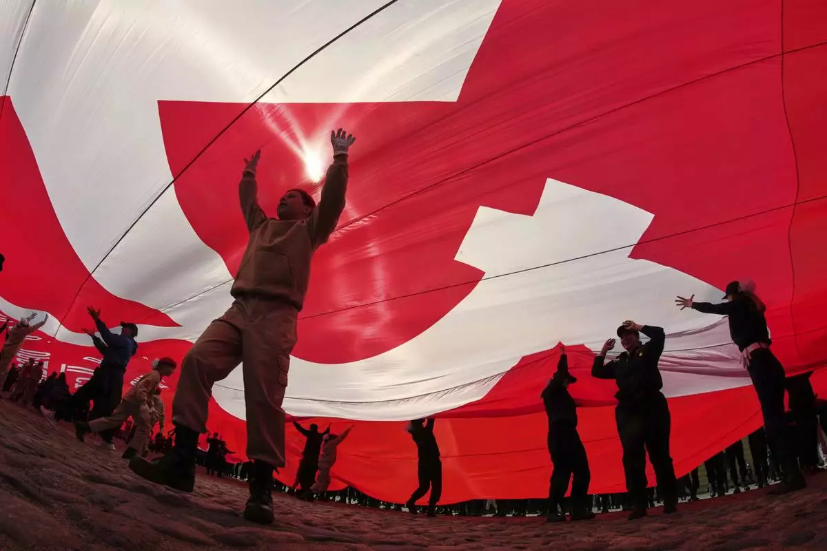 Cadets and young volunteers unfurl a giant replica of the Soviet Flag of Victory, during a continued observance of Victory Day. celebrating 80 years after the victory in World War II, in St. Petersburg, Russia, Thursday, May 15, 2025. (AP Photo/Dmitri Lovetsky)