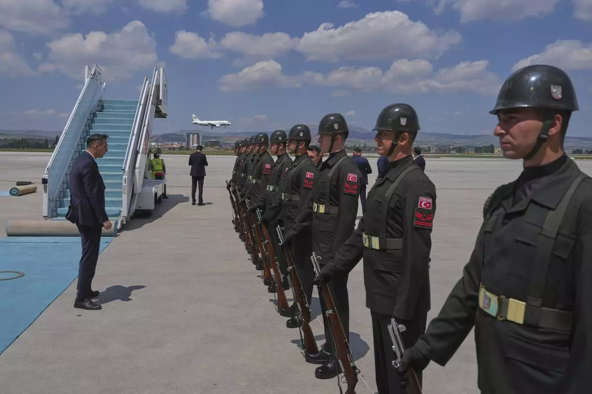Ukrainian official plane, background, with Ukrainian President Volodymyr Zelenskyy on board lands at Esenboga airport in Ankara, Turkey, Thursday, May 15, 2025. (AP Photo/Evgeniy Maloletka)