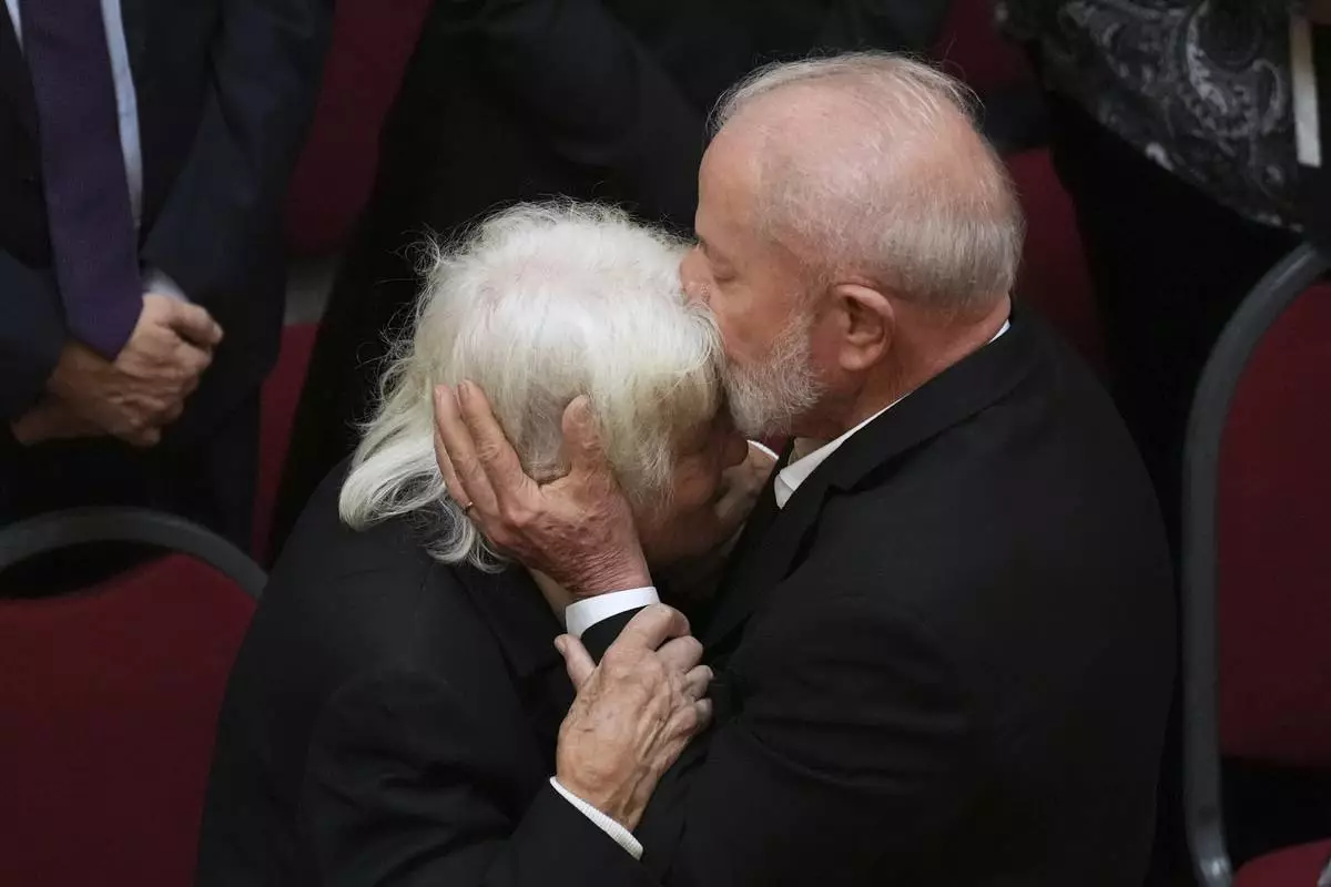 Brazil's President Luiz Inacio Lula Da Silva kisses Lucia Topolansky, widow of former Uruguayan President Jose Mujica, during funeral ceremonies for the late leader at the Legislative Palace in Montevideo, Uruguay, Thursday, May 15, 2025. (AP Photo/Matilde Campodonico)