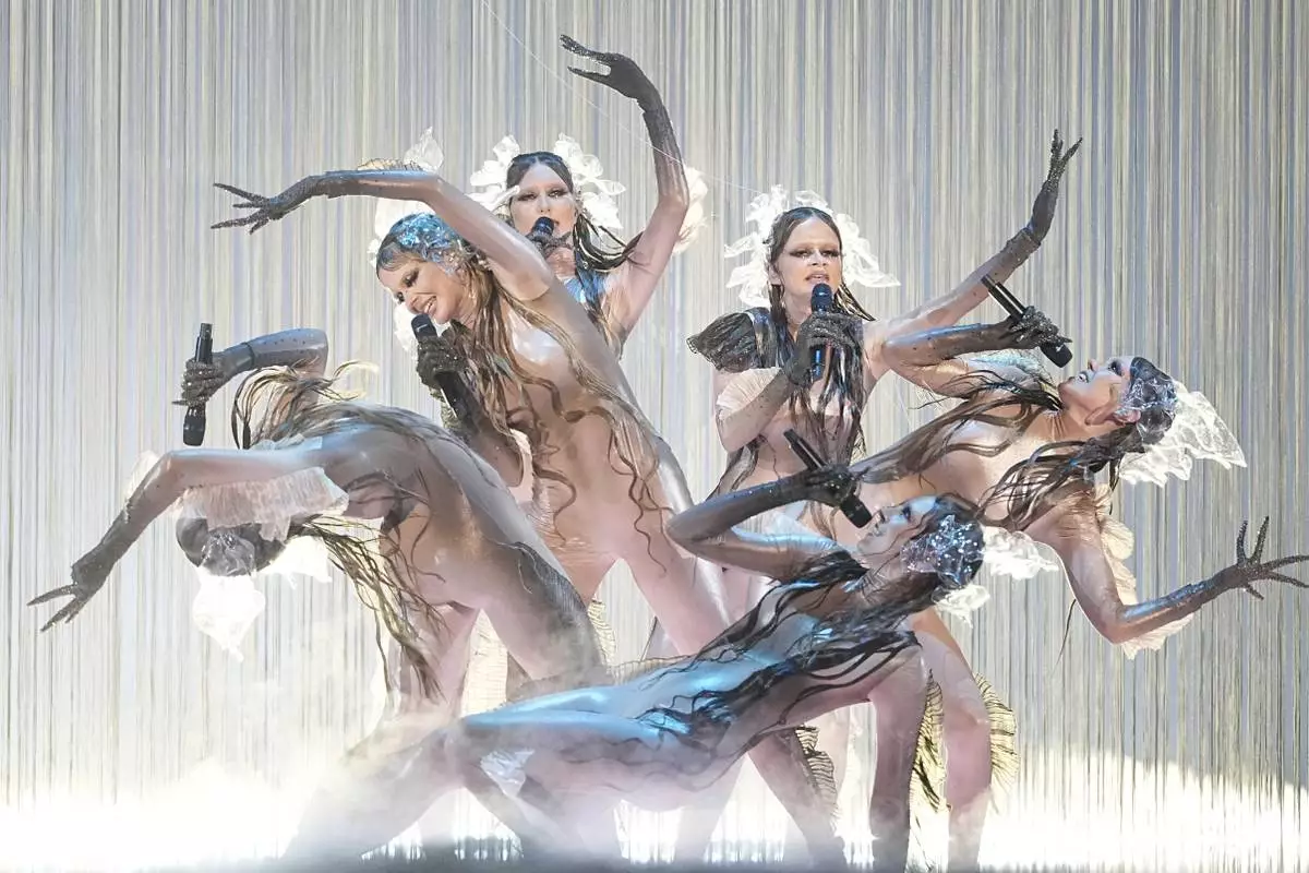 Tautumeitas from Latvia performs the song "Bur Man Laimi" during the second semi-final of the 69th Eurovision Song Contest, in Basel, Switzerland, Thursday, May 15, 2025. (AP Photo/Martin Meissner)