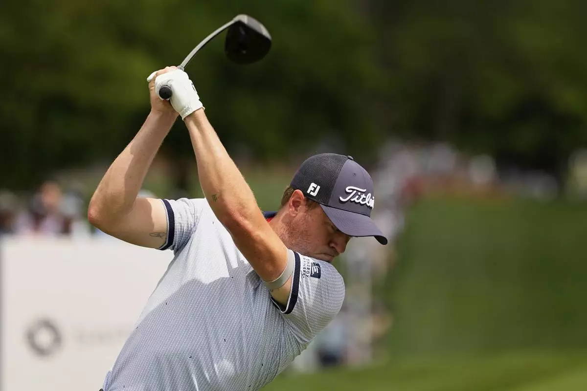 Justin Thomas hits his tee shot on the eighth hole during the first round of the PGA Championship golf tournament at the Quail Hollow Club, Thursday, May 15, 2025, in Charlotte, N.C. (AP Photo/David J. Phillip)