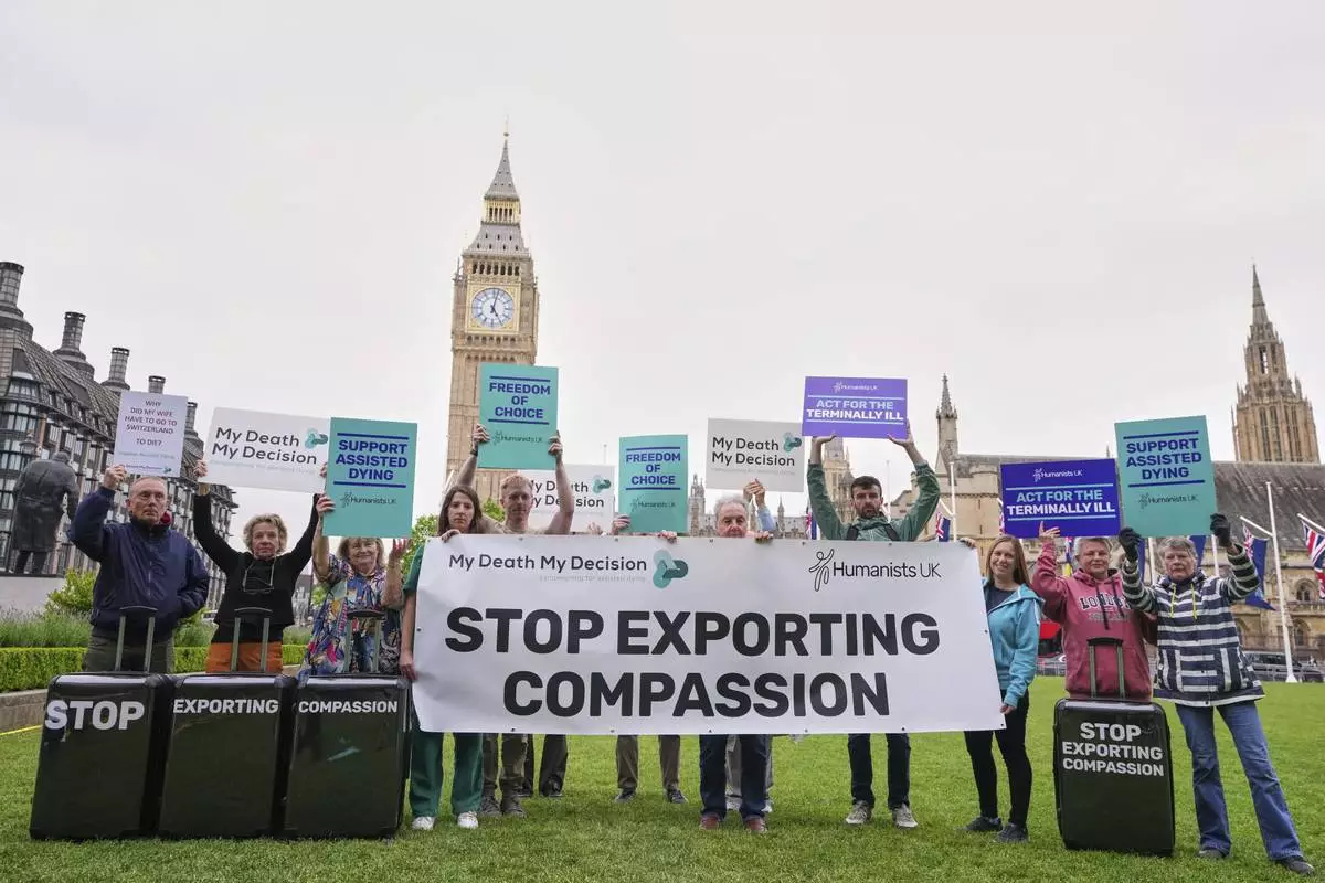 Pro-assisted dying campaigners gather outside Parliament ahead of Fridays report stage in the Commons on The Terminally Ill Adults (End of Life) Bill, which is expected to see MPs vote on further amendments, in Westminster in London, Thursday, May 15, 2025. (AP Photo/Kirsty Wigglesworth)