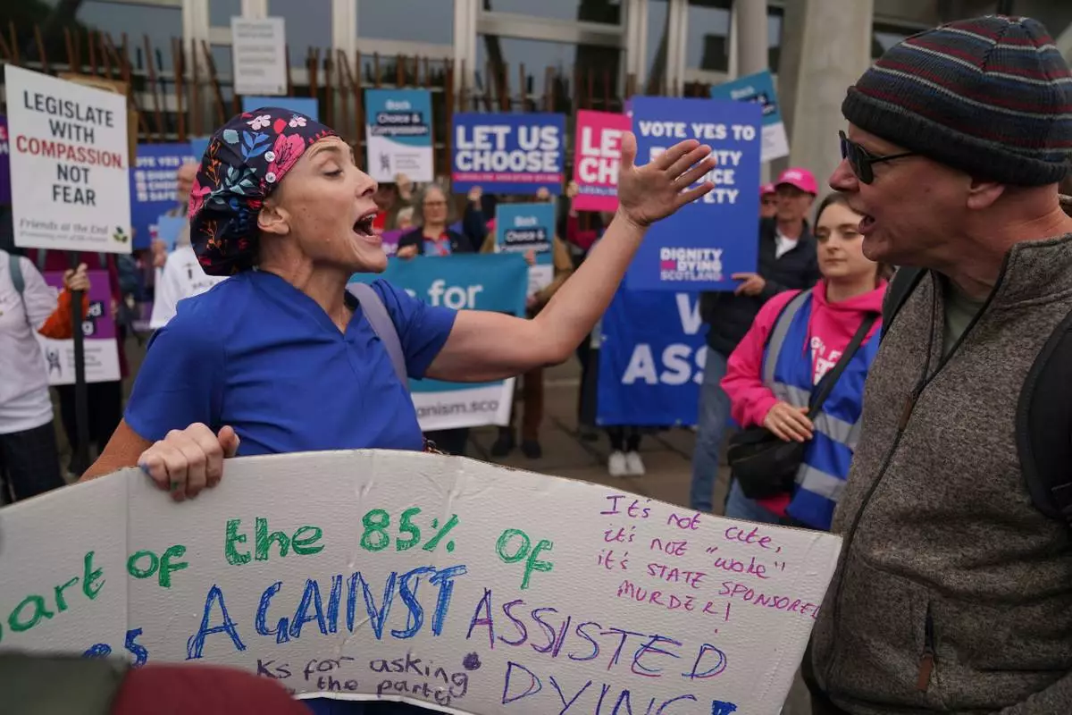 Doctor Geri Hignett protests against a change in the law on assisted dying, beside protesters demonstrating in support, outside the Scottish Parliament in Edinburgh, ahead of the debate and vote on the Assisted Dying for Terminally Ill Adults (Scotland) Bill Tuesday, May 13, 2025. (Andrew Milligan/PA via AP)