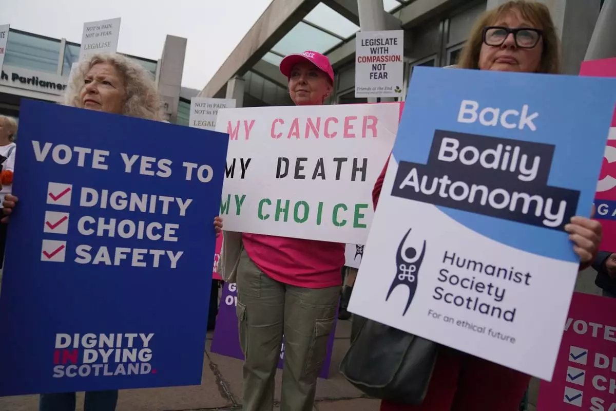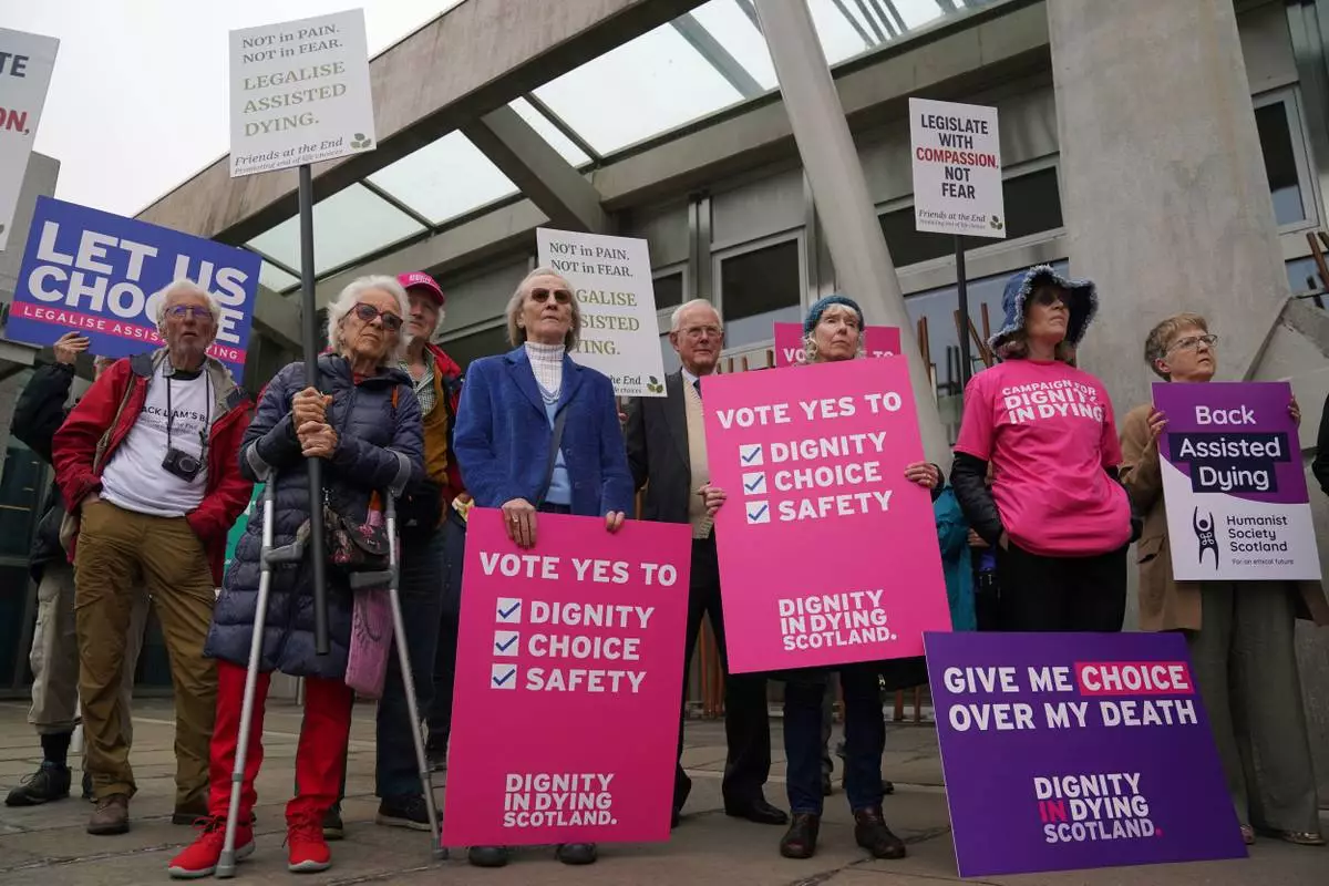 Members of Dignity in Dying Scotland and members of the Assisted Dying Coalition gather as they show their support for a change in the law on assisted dying outside the Scottish Parliament in Edinburgh, ahead of the debate and vote on the Assisted Dying for Terminally Ill Adults (Scotland) Bill Tuesday, May 13, 2025. (Andrew Milligan/PA via AP)