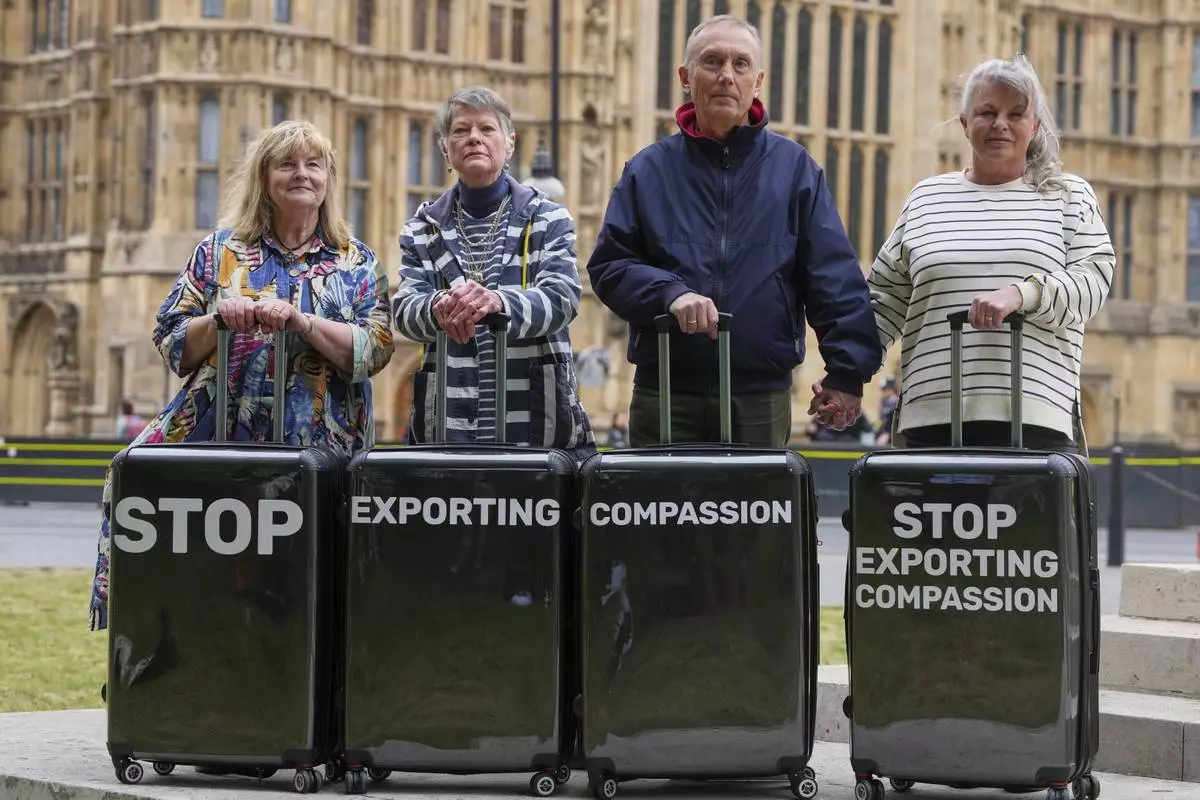 Pro-assisted dying campaigners Sue Lawford, left, Sara Starkey, second left, Dave Sowry, second right, and Louise Shackleton, right, gather outside Parliament ahead of Fridays report stage in the Commons on The Terminally Ill Adults (End of Life) Bill, which is expected to see MPs vote on further amendments, in Westminster in London, Thursday, May 15, 2025. (AP Photo/Kirsty Wigglesworth)