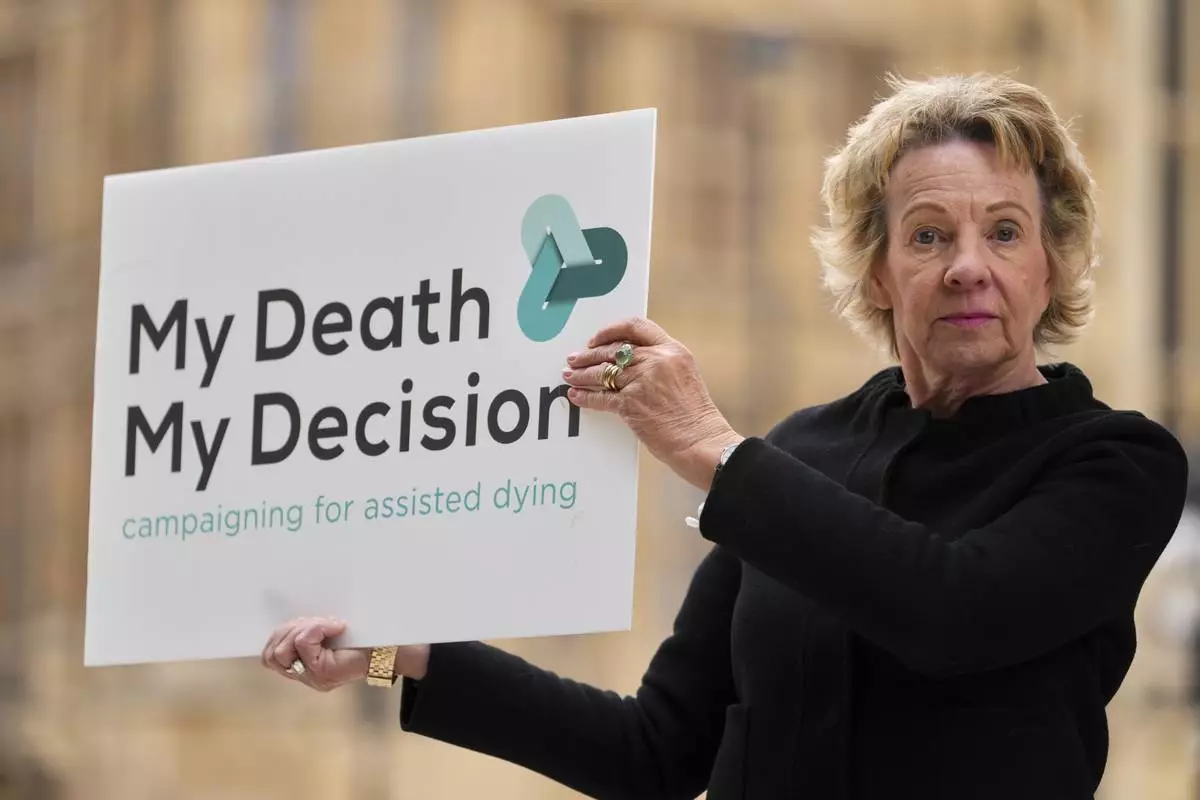 Pro-assisted dying campaigner Claire Macdonald holds a placard outside Parliament ahead of Fridays report stage in the Commons on The Terminally Ill Adults (End of Life) Bill which is expected to see MPs vote on further amendments, in Westminster in London, Thursday, May 15, 2025. (AP Photo/Kirsty Wigglesworth)