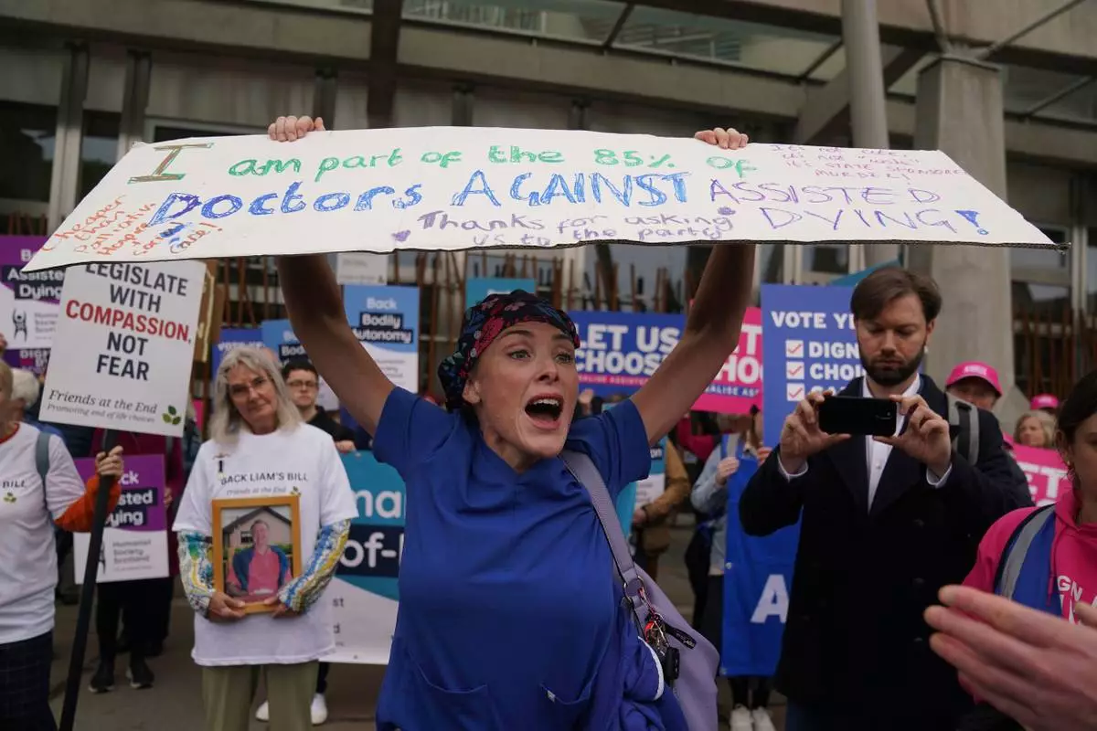 Doctor Geri Hignett protests against a change in the law on assisted dying outside the Scottish Parliament in Edinburgh, ahead of the debate and vote on the Assisted Dying for Terminally Ill Adults (Scotland) Bill Tuesday, May 13, 2025. (Andrew Milligan/PA via AP)