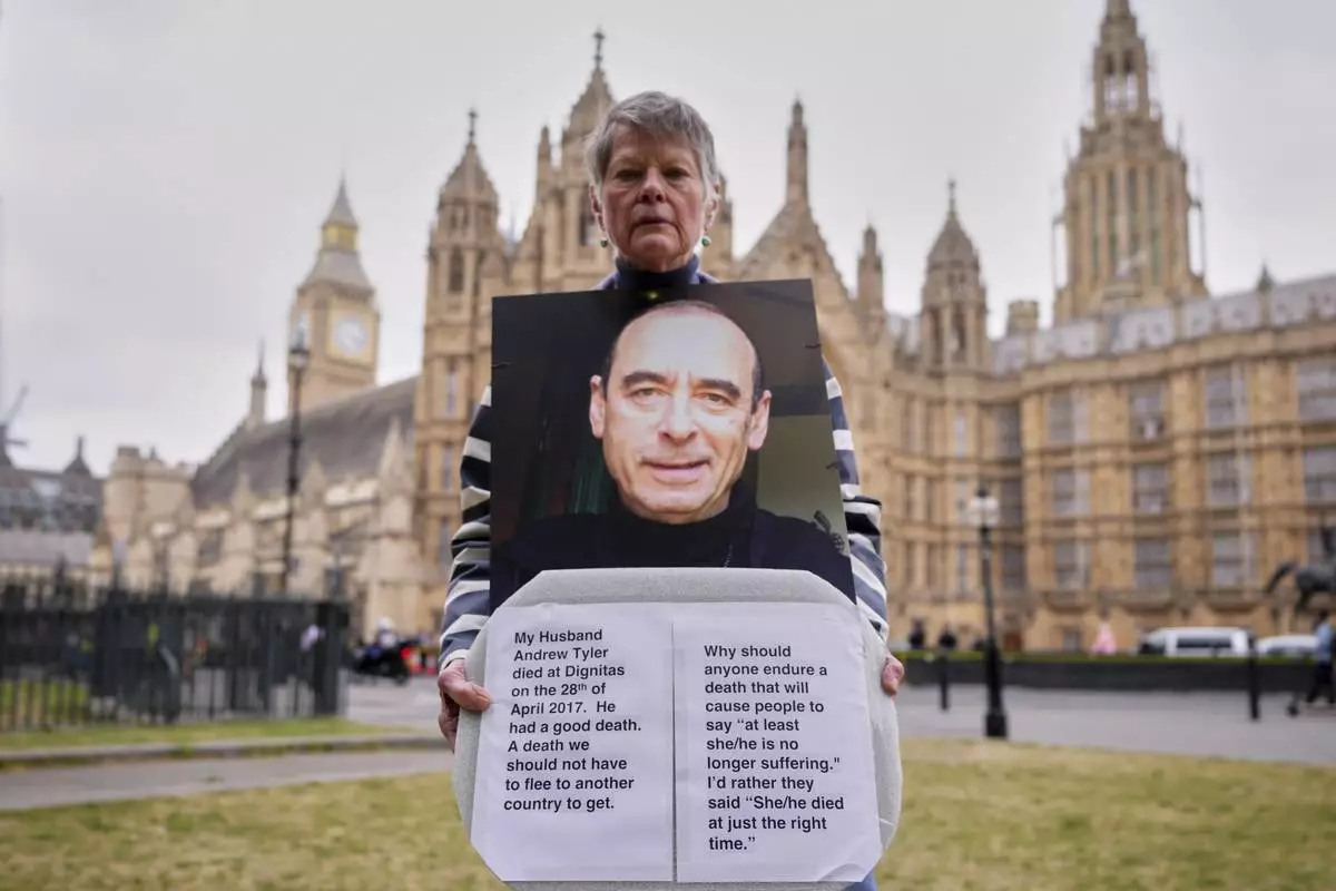Pro-assisted dying campaigner Sara Starkey holds a picture of her late husband Andrew Tyler, outside Parliament ahead of Fridays report stage in the Commons on The Terminally Ill Adults (End of Life) Bill, which is expected to see MPs vote on further amendments, in Westminster in London, Thursday, May 15, 2025. (AP Photo/Kirsty Wigglesworth)