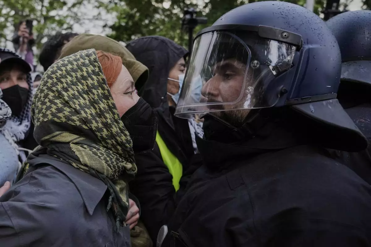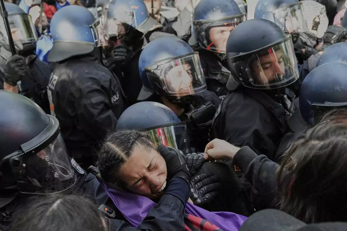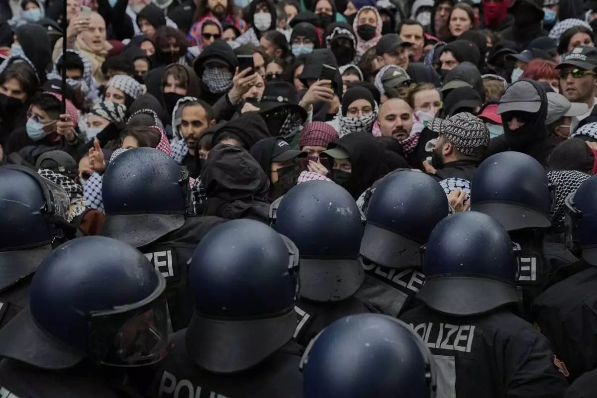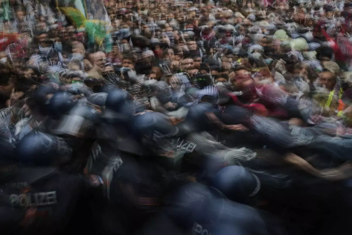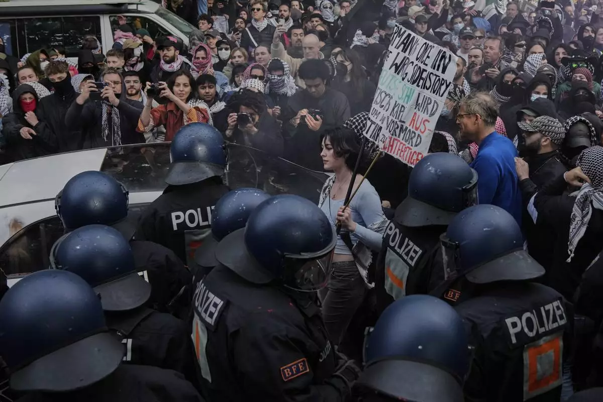 Police officers clash with protesters during a demonstration to commemorate the Nakba Day in Berlin, Germany, Thursday, May 15, 2025. (AP Photo/Ebrahim Noroozi)