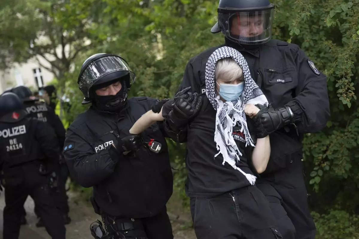 Police officers arrest a pro-Palestinians during a demonstration to commemorate the Nakba Day in Berlin, Germany, Thursday, May 15, 2025. (AP Photo/Ebrahim Noroozi)