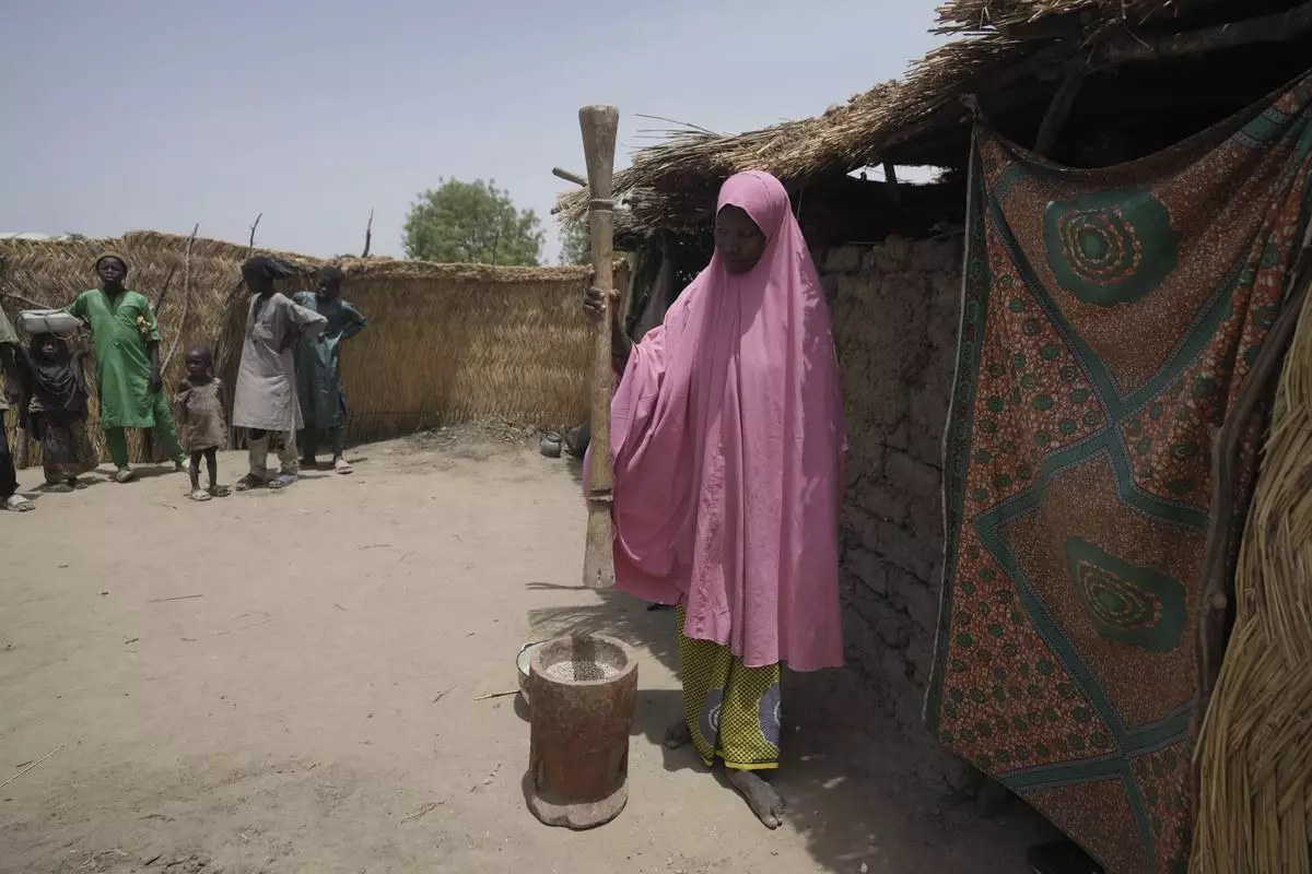 Yagana Bulama, a 40 years old woman pounds guinea corn outside her thatched shelter in Dikwa, northeastern, Nigeria, Tuesday, April 29, 2025. (AP Photo/Sunday Alamba)