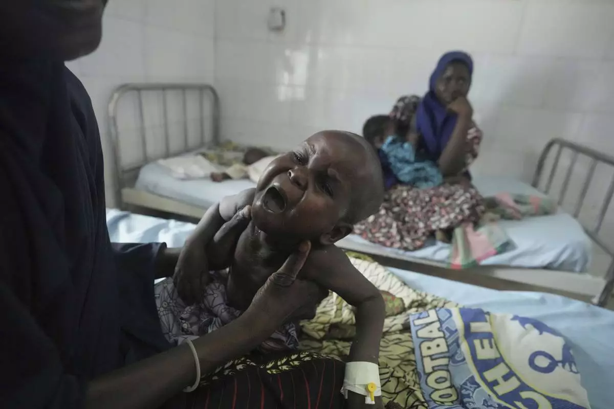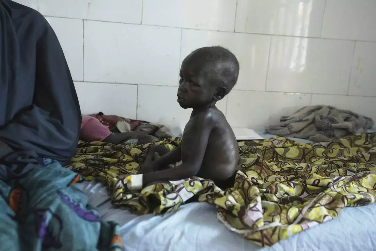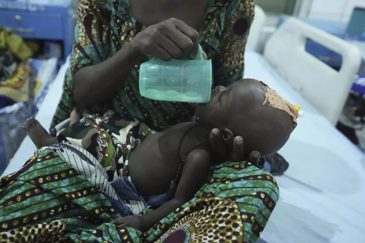 A malnourished child received treatment at the Intersos facility, an Italian humanitarian organization, the only remaining facility providing in-patient services for malnutrition in Dikwa, northeastern, Nigeria, Tuesday, April 29, 2025. (AP Photo/Sunday Alamba)