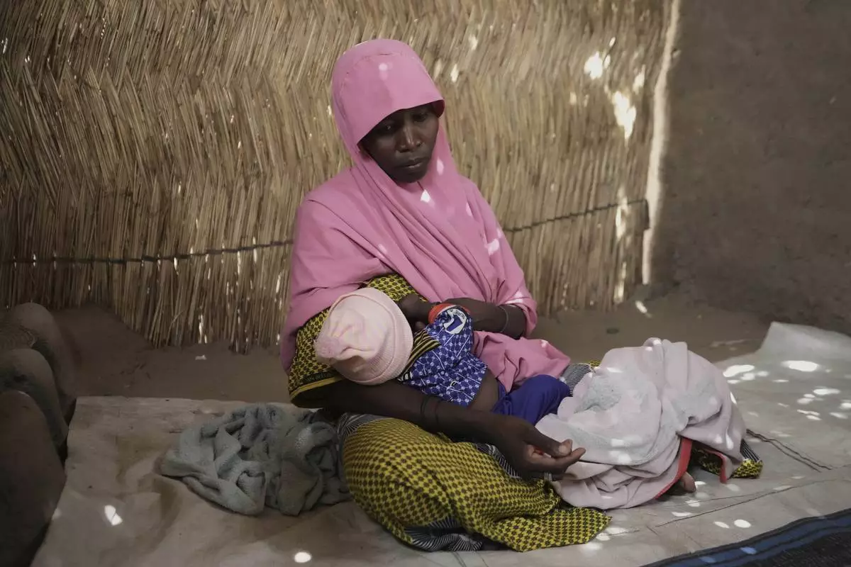 Yagana Bulama, a 40 years old woman breast feed her surviving infant under the dappled light of a thatched shelter in Dikwa, northeastern, Nigeria, Tuesday, April 29, 2025. (AP Photo/Sunday Alamba)