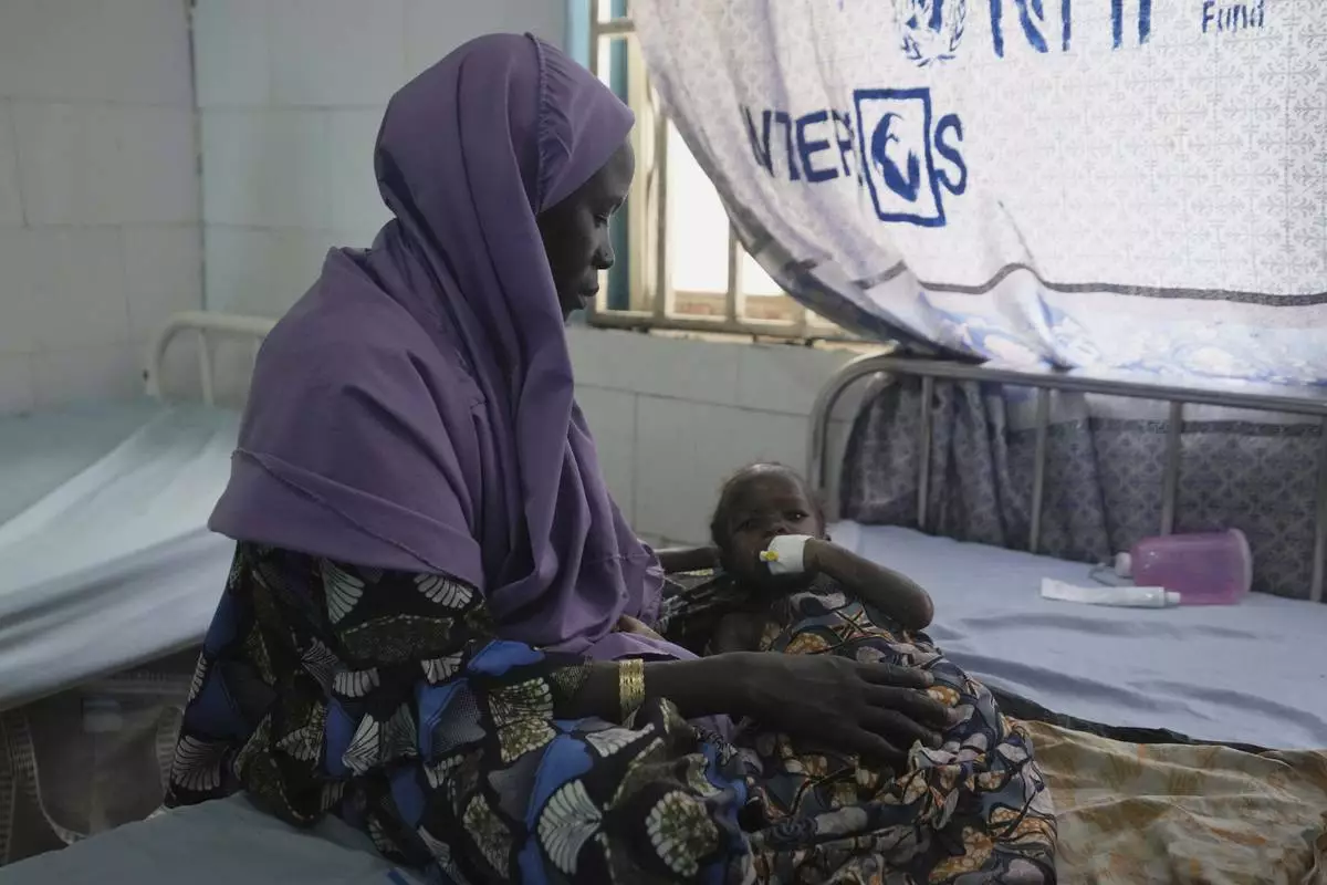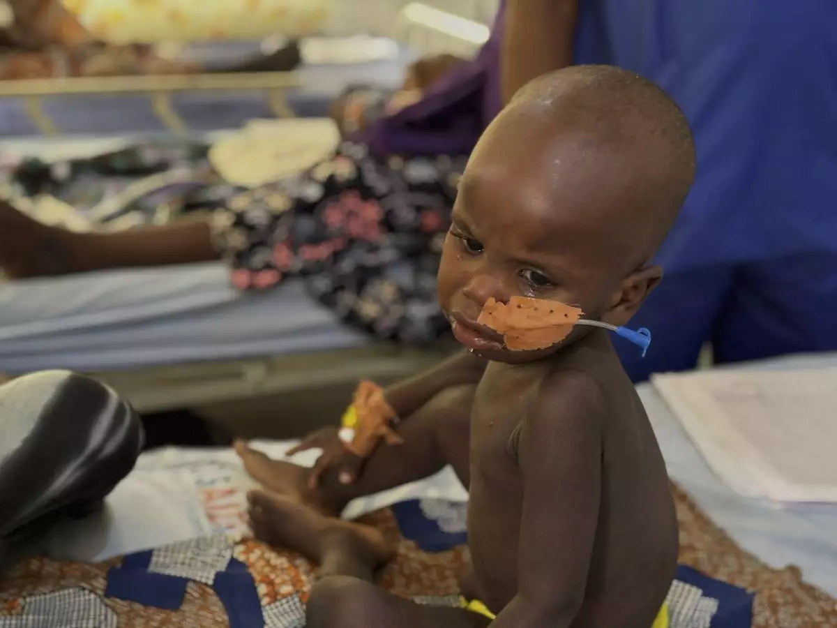 A malnourished child receives treatment at the Intersos facility, an Italian humanitarian organization, the only remaining facility providing in-patient services for malnutrition in Dikwa, northeastern, Nigeria, Tuesday, April 29, 2025. (AP Photo/Sunday Alamba)
