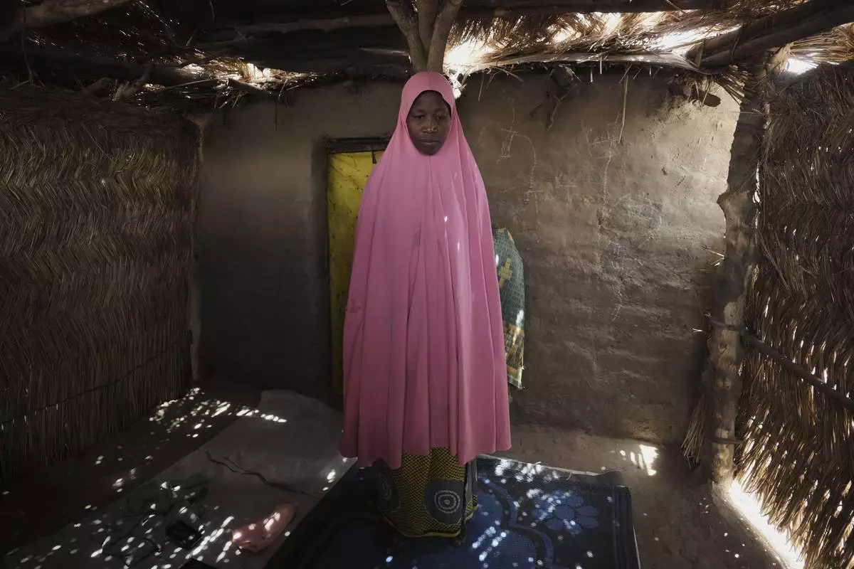 Yagana Bulama, a 40 years old woman is photographed under the dappled light of a thatched shelter in Dikwa, northeastern, Nigeria, Tuesday, April 29, 2025. (AP Photo/Sunday Alamba)