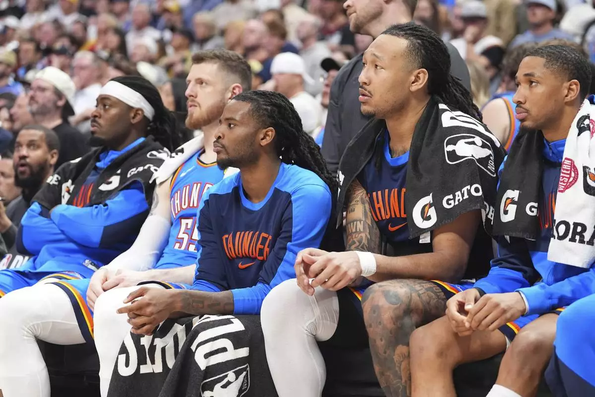 From left, Oklahoma City Thunder guard Luguentz Dort, center Isaiah Hartenstein, guard Cason Wallace, forward Jaylin Williams and guard Aaron Wiggins look on from the bench as time runs out in the second half of Game 6 in the Western Conference semifinals of the NBA basketball playoffs against the Denver Nuggets Thursday, May 15, 2025, in Denver. (AP Photo/David Zalubowski)
