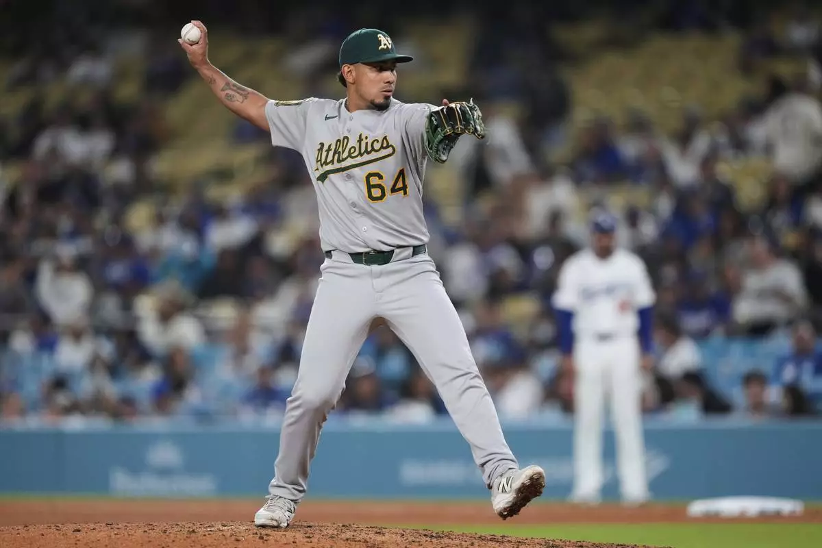 Athletics' Jhonny Pereda throws to a Los Angeles Dodgers batter during the eighth inning of a baseball game Thursday, May 15, 2025, in Los Angeles. (AP Photo/Mark J. Terrill)