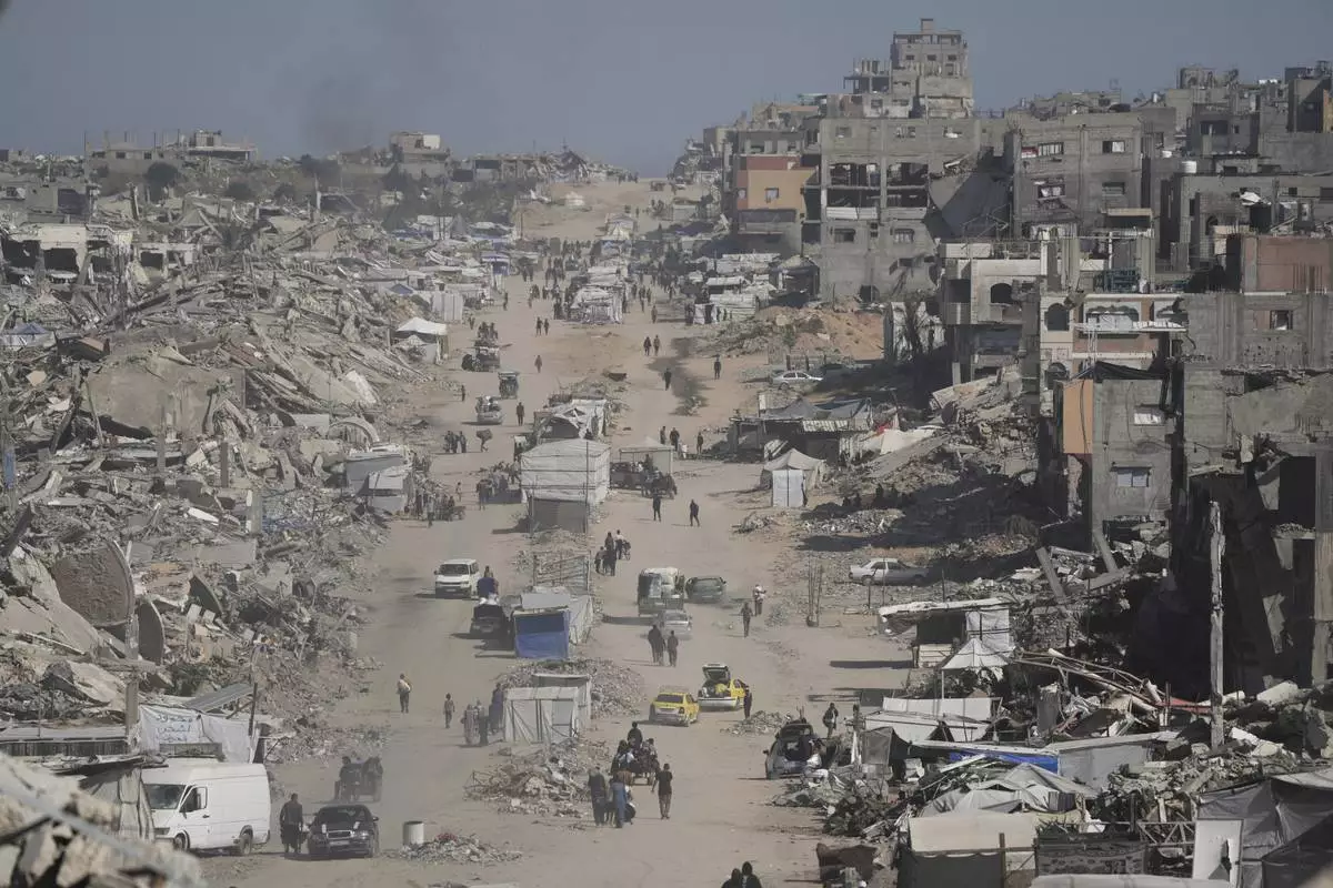 Palestinians inspect the rubble of the Al-Lahham family's home, destroyed by Israeli airstrikes in Khan Younis, Gaza Strip, on Thursday, May 15, 2025. (AP Photo/Abdel Kareem Hana)