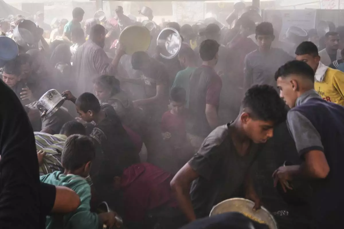 Palestinians struggle to get donated food at a community kitchen in Jabalia, northern Gaza Strip, Thursday, May 15, 2025. (AP Photo/Jehad Alshrafi)