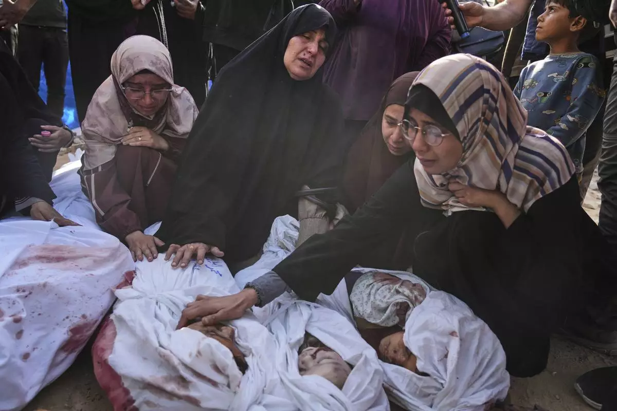 Palestinians mourn children from their families who were killed in Israeli airstrikes in Jabalia, in the northern Gaza Strip, on Wednesday, May 14, 2025. According to local hospitals, the strikes killed 48 people, including 22 children. (AP Photo/Jehad Alshrafi)