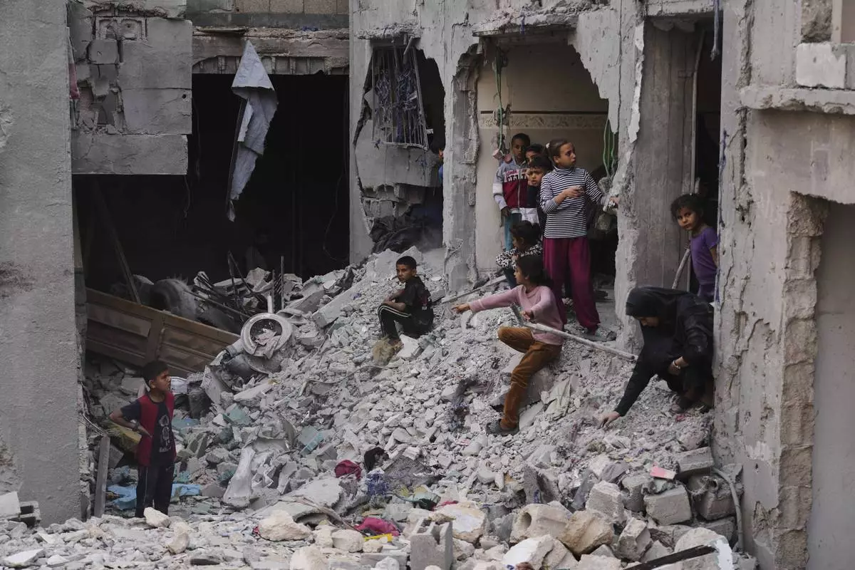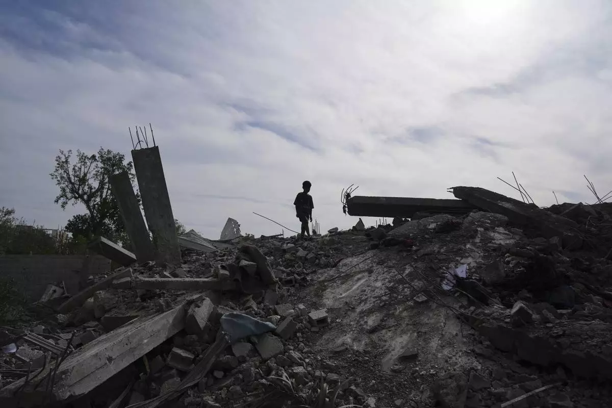 A Palestinian kid walks on the rubble of the Al-Zainati family's home, destroyed by Israeli airstrikes in Khan Younis, Gaza Strip, on Thursday, May 15, 2025. (AP Photo/Abdel Kareem Hana)