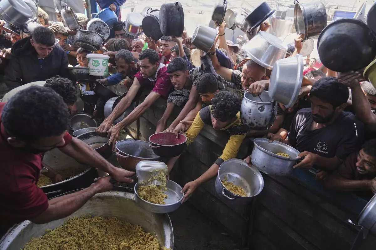Palestinians struggle to get donated food at a community kitchen in Khan Younis, Gaza Strip, Friday, May 16, 2025. (AP Photo/Abdel Kareem Hana)