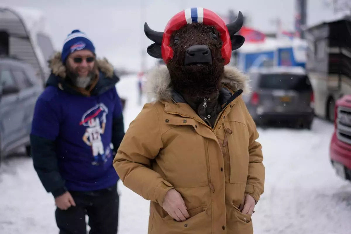 Aga Deters, right, and her husband Fred Deters, walk near Highmark Stadium before an NFL football game between the Buffalo Bills and the New York Jets, Sunday, Jan. 4, 2026, in Orchard Park, N.Y. (AP Photo/Carolyn Kaster)