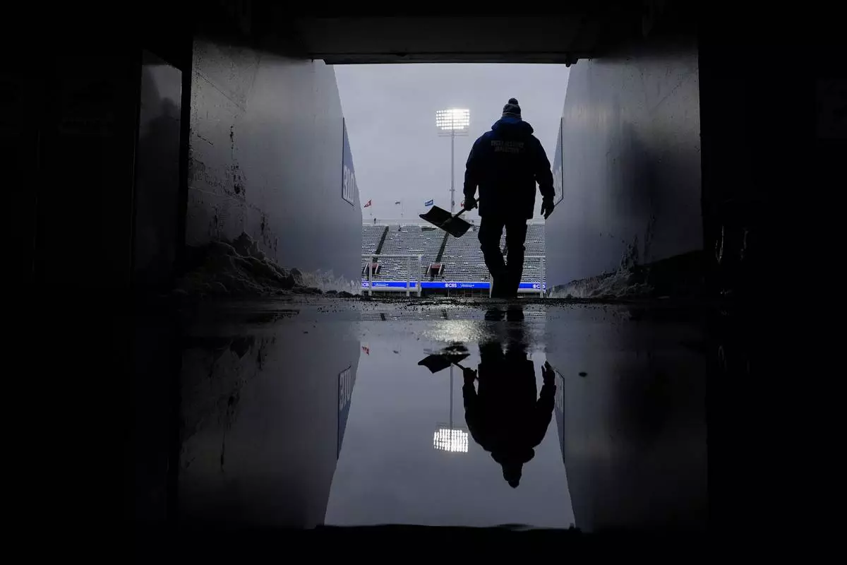 Michael Wygant shoves snow from a tunnel before an NFL football game between the Buffalo Bills and the New York Jets at Highmark Stadium, Sunday, Jan. 4, 2026, in Orchard Park, N.Y. (AP Photo/Carolyn Kaster)