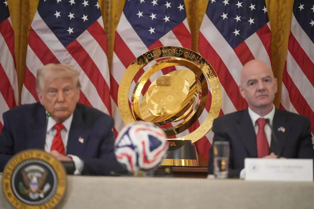 The FIFA club World Cup trophy sits between President Donald Trump and FIFA President Gianni Infantino during a FIFA task force meeting on the 2026 FIFA World Cup in the East Room of the White House, Tuesday, May 6, 2025, in Washington. (AP Photo/Mark Schiefelbein)
