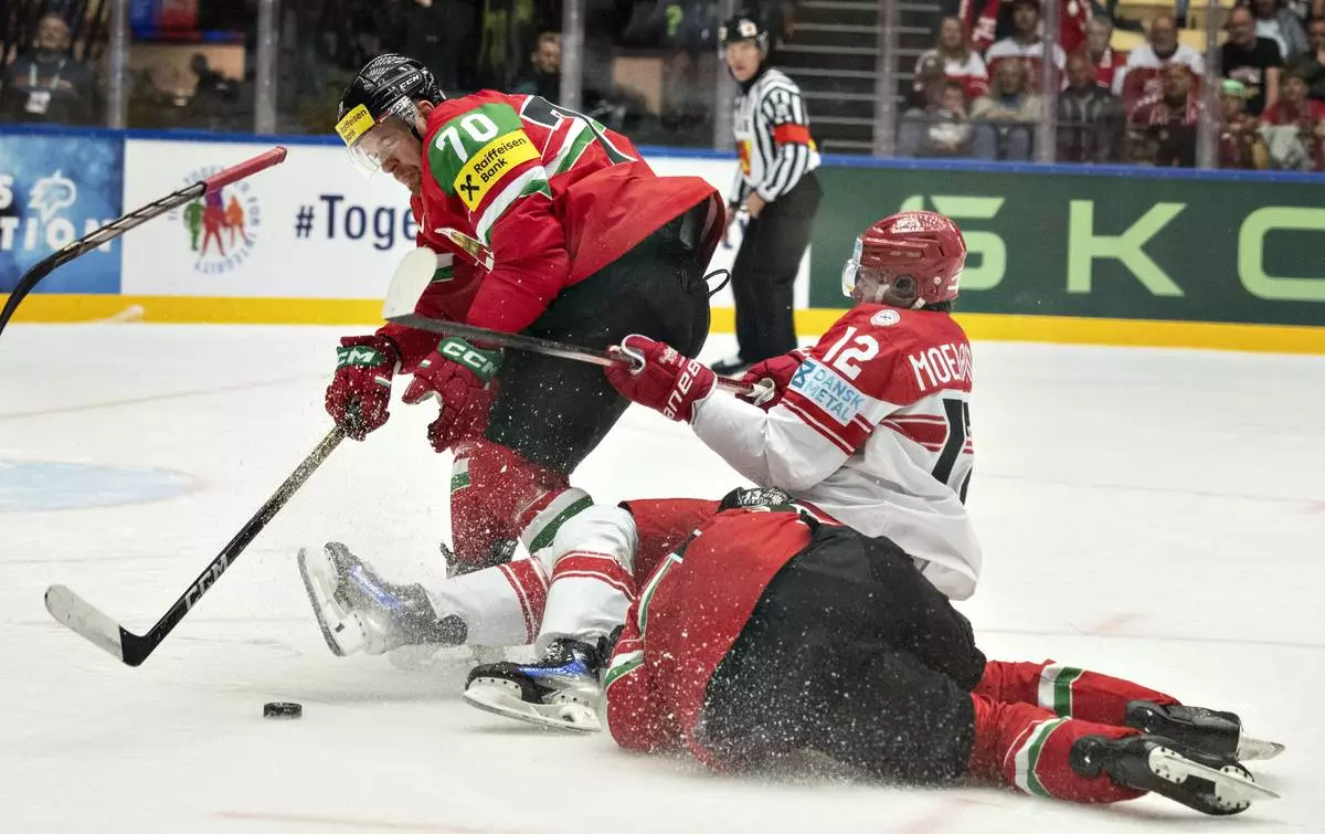 Oscar Fisker Moelgaard of Denmark challenges Zsombor Garat of Hungary during the group B match between Denmark and Hungary at the IIHF Ice Hockey World Championships in Herning, Denmark, Friday May 16, 2025. (Henning Bagger/Ritzau Scanpix via AP)