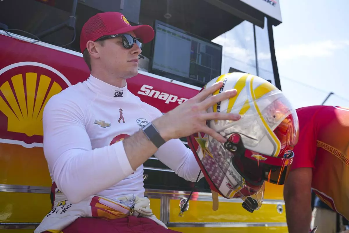 Josef Newgarden checks his helmet as he waits for the start of practice for the Indianapolis 500 auto race at Indianapolis Motor Speedway in Indianapolis, Friday, May 16, 2025. (AP Photo/Michael Conroy)