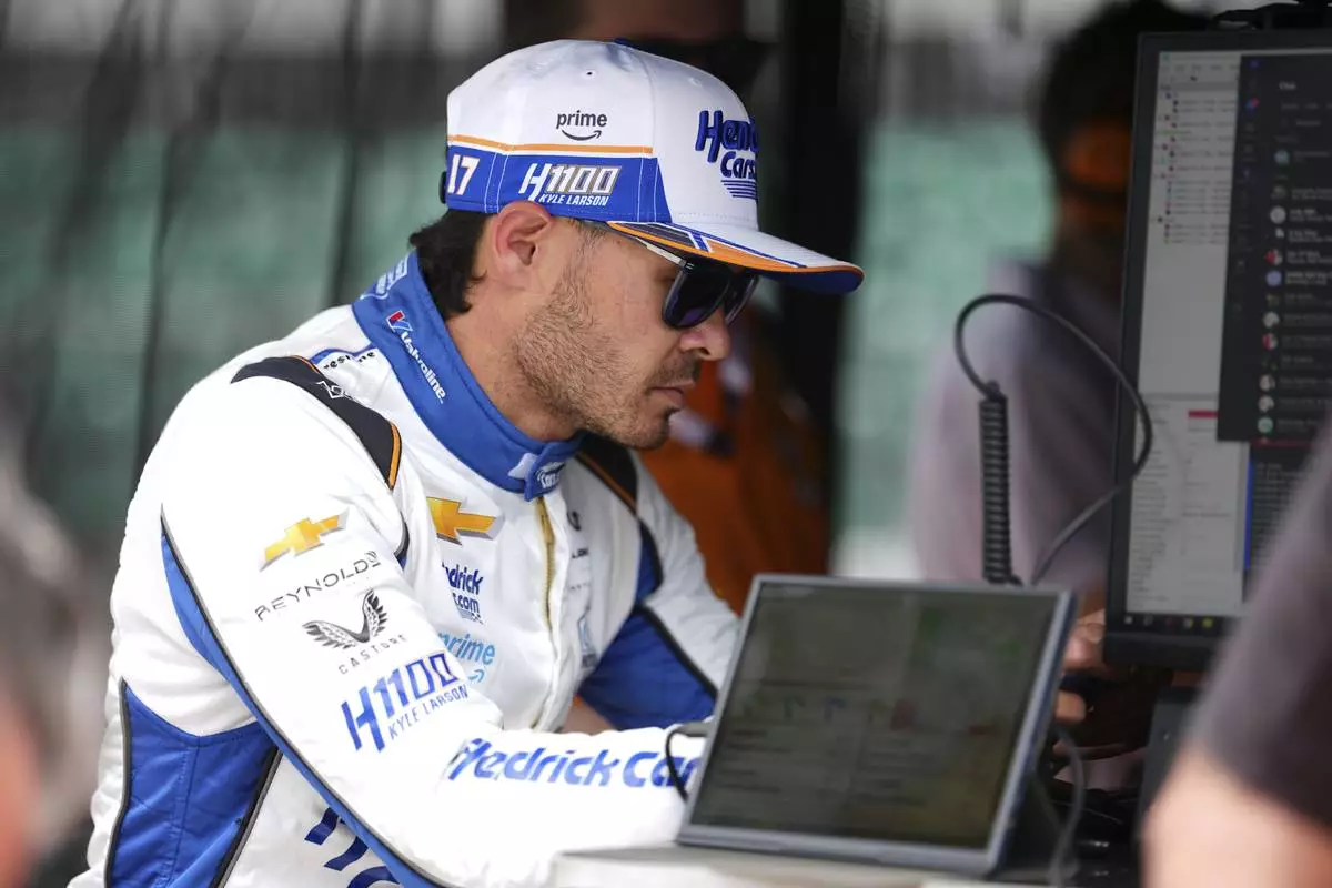 Kyle Larson looks over data after driving during practice for the Indianapolis 500 auto race at Indianapolis Motor Speedway in Indianapolis, Wednesday, May 14, 2025. (AP Photo/Michael Conroy)