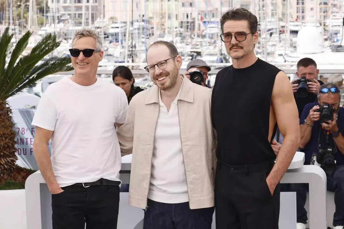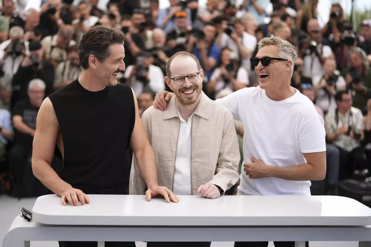 Joaquin Phoenix, from left, director Ari Aster and Pedro Pascal pose for photographers at the photo call for the film 'Eddington' at the 78th international film festival, Cannes, southern France, Saturday, May 17, 2025. (Photo by Joel C Ryan/Invision/AP)