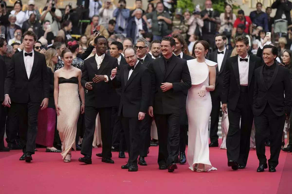 Cameron Mann, from left, Amelie Hoeferle, Micheal Ward, director Ari Aster, Joaquin Phoenix, Emma Stone, Austin Butler and Clifton Collins Jr. pose for photographers upon arrival at the premiere of the film 'Eddington' at the 78th international film festival, Cannes, southern France, Friday, May 16, 2025. (AP Photo/Natacha Pisarenko)