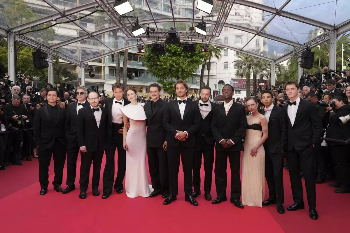 Clifton Collins Jr., from left, Joaquin Phoenix, director Ari Aster, Austin Butler, Emma Stone, Pedro Pascal, Luke Grimes, producer Lars Knudsen, Micheal Ward, Amelie Hoeferle, Matt Gomez Hidaka and Cameron Mann pose for photographers upon arrival at the premiere of the film 'Eddington' at the 78th international film festival, Cannes, southern France, Friday, May 16, 2025. (AP Photo/Natacha Pisarenko)