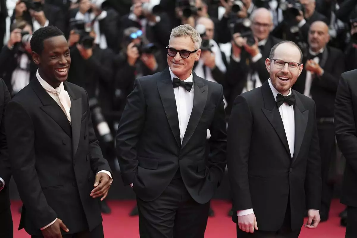 Micheal Ward, from left, Joaquin Phoenix and director Ari Aster pose for photographers upon arrival at the premiere of the film 'Eddington' at the 78th international film festival, Cannes, southern France, Friday, May 16, 2025. (Photo by Lewis Joly/Invision/AP)