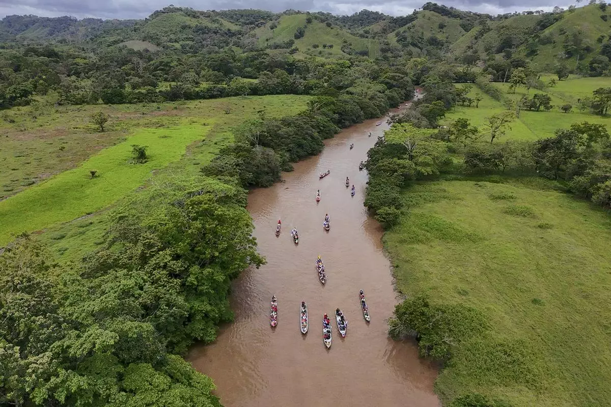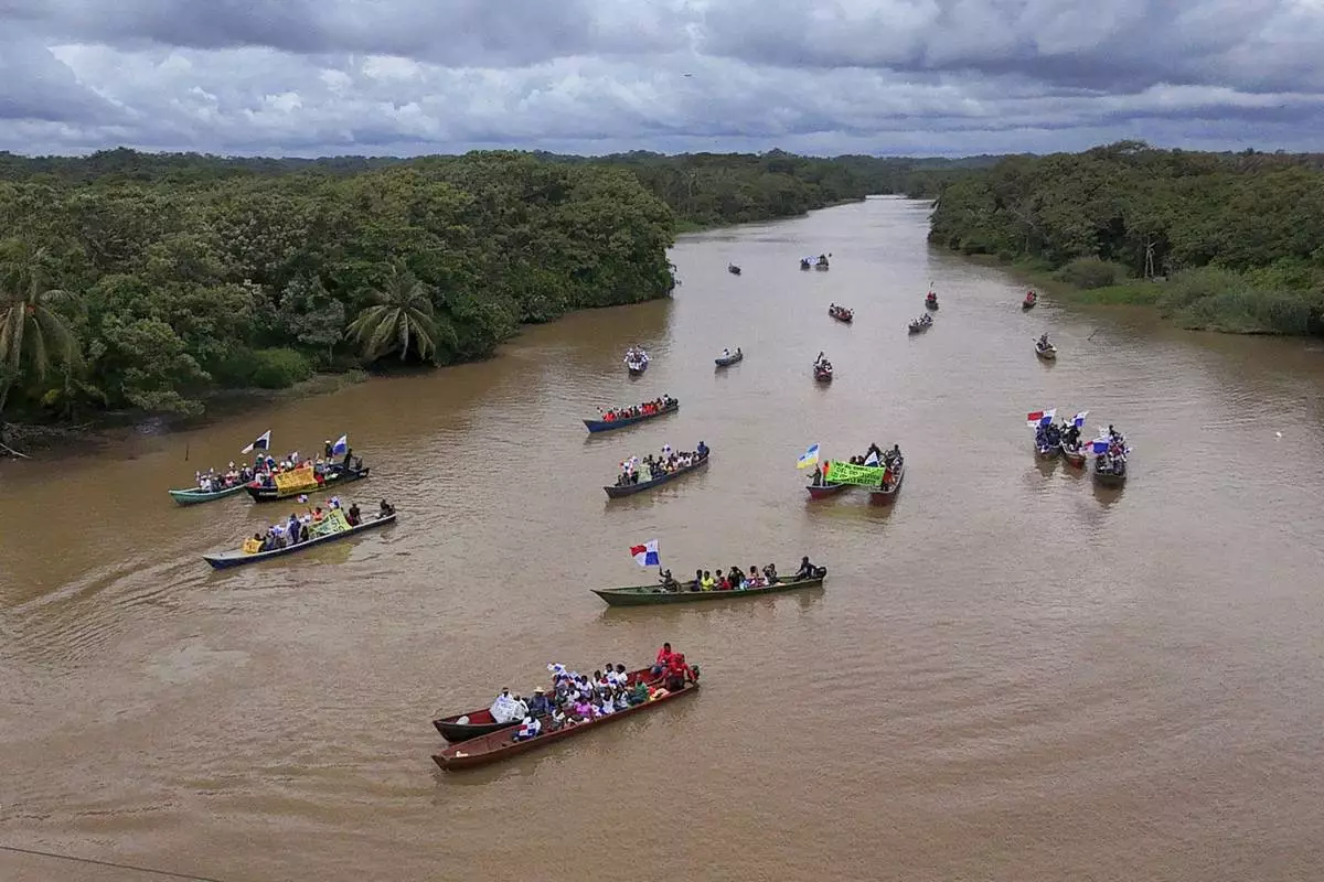 PANAMA CITY (AP) — Dozens of boats carrying around 200 people, mostly farmers waving Panamanian flags, traveled along the country's central Indio River on Friday to protest a planned reservoir in the Panama Canal intended to solve water shortages in the waterway that have threatened international trade flow.